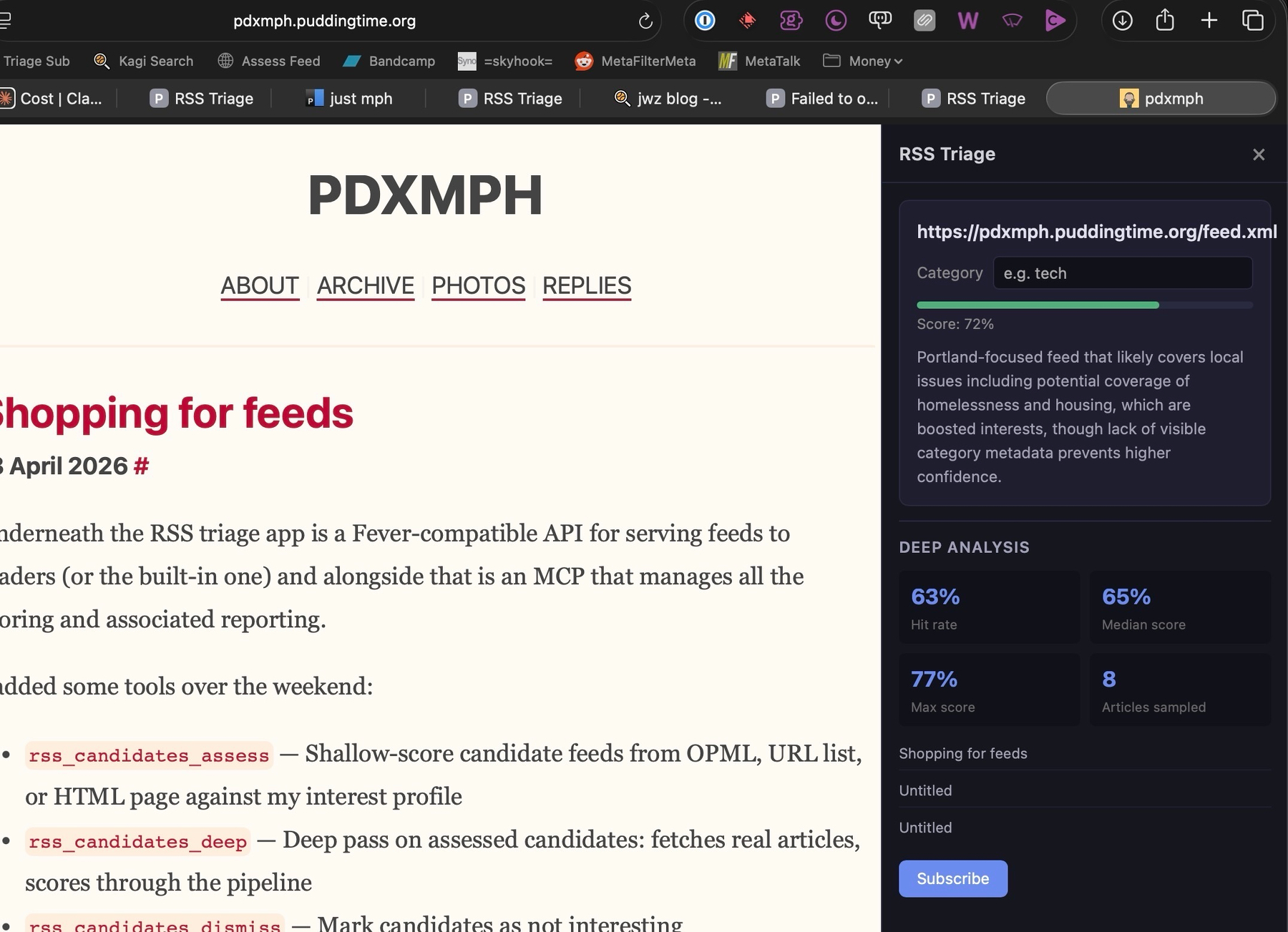 I also built an endpoint to feed a URL in via a bookmarklet (or eventual browser extension), so the traditional “subscribe to this site” bookmarklet gets a makeover by using the scoring pipeline to offer a quick summary before categorizing and subscribing.