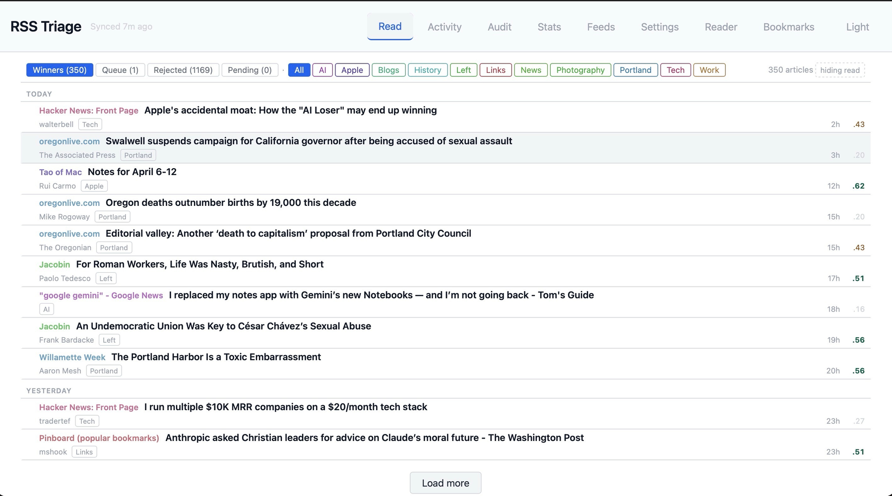 Architecturally, I could reduce this to a worker on a cron job that passes each article through user rules, then passes the survivors through to beefed up inference. Unlike RSS feeds, which have no state, Readwise would support this approach because things it finds in RSS become articles that can be removed from your queue. The other idea I considered was creating and serving a shadow Oregonian feed that’s been through triage.