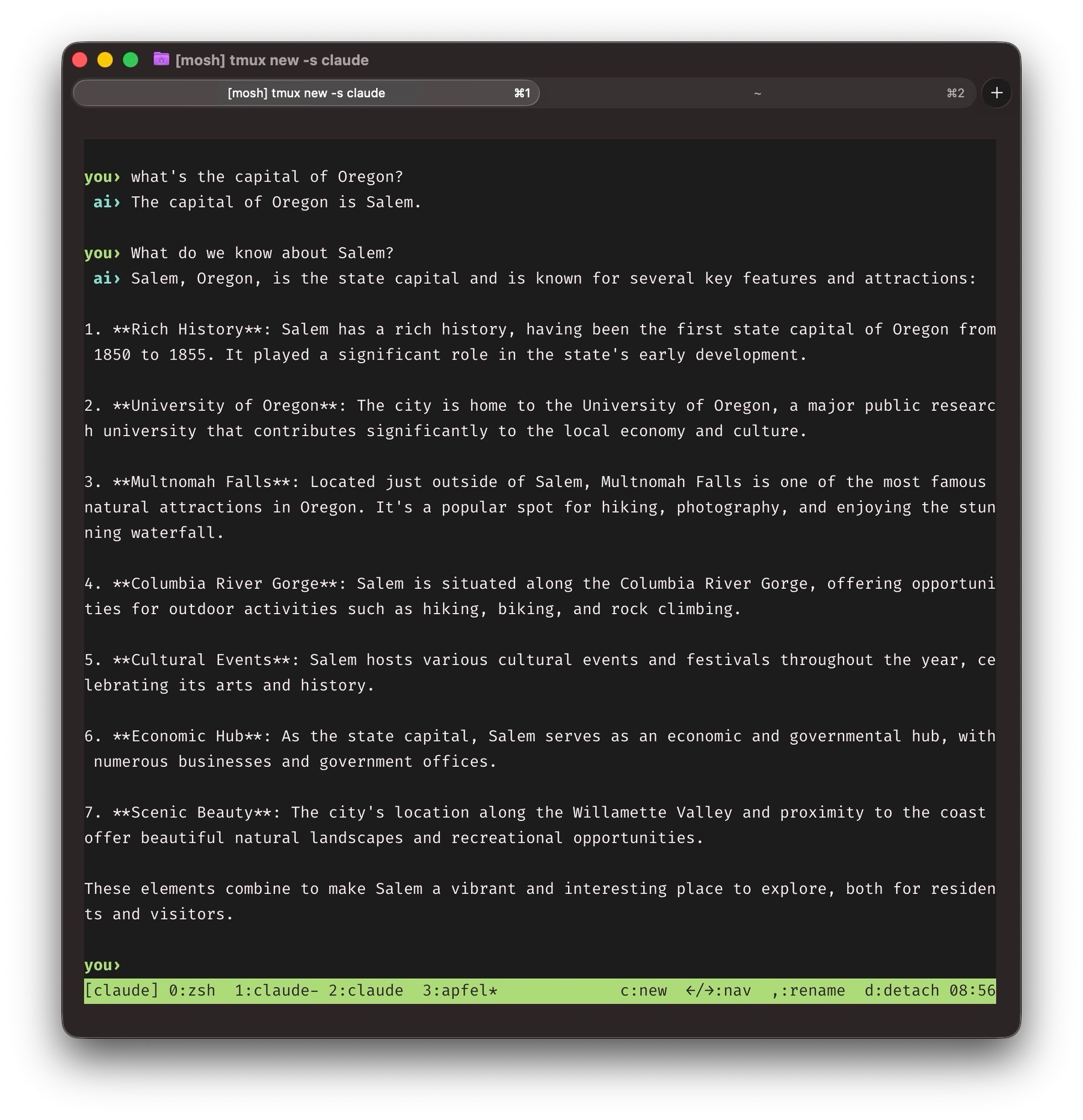 apfel gives you an interface to the local LLM Apple ships on macOS. It has a small context window and is interesting perhaps for the way you could use it to wire inference into a shell script. It’s right about some things. I hope nobody from Planet Apple plans a roadtrip to Oregon with it.