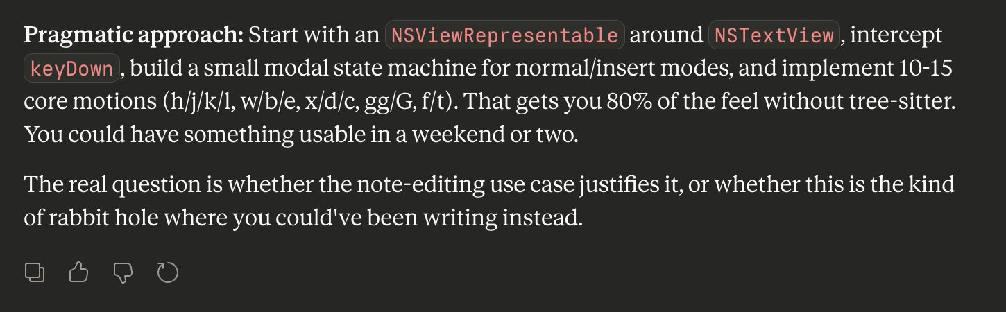 Inference is great in the spaces, doing things that I’d just consume a dependency to get (e.g. topic extraction) or understanding roughly – well enough – what my assorted likes and dislikes add up to for a given article. But I still want to be in the loop. Human in the loop doesn’t always have to mean “human hovering over the lever,” it can just mean “human nudging the flow this way and that.”