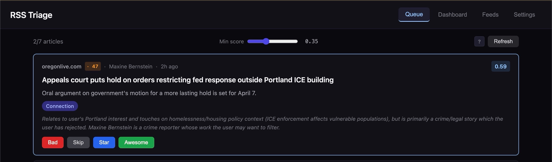 So when an article comes in, a cheap Haiku agent takes a look, factors in my previous feedback and my interest list. The fun part is that the app also talks to aSystems notes, ideas, and tasks, so Haiku knows to look for relevance there. Likewise, as AI development articles come in, especially ones about “human-in-the-loop” and ML, it’s looking at my aSystem feature backlog and noting the relevance.